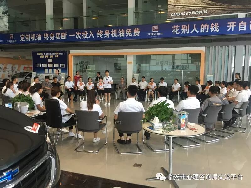 7月19日下午,在临汾天健雪佛兰的销售大厅,临汾市心理咨询协会副会长王美荣为天健致远全体员工进行了一次以“团队熔炼、凝心聚力”为主题的团辅活动,目的是通过活动感受团队协作中个人能力发挥的重要性,同时通过队员相互激励与支持,增强应对压力的信心,依托团队的力量,找到归属感。