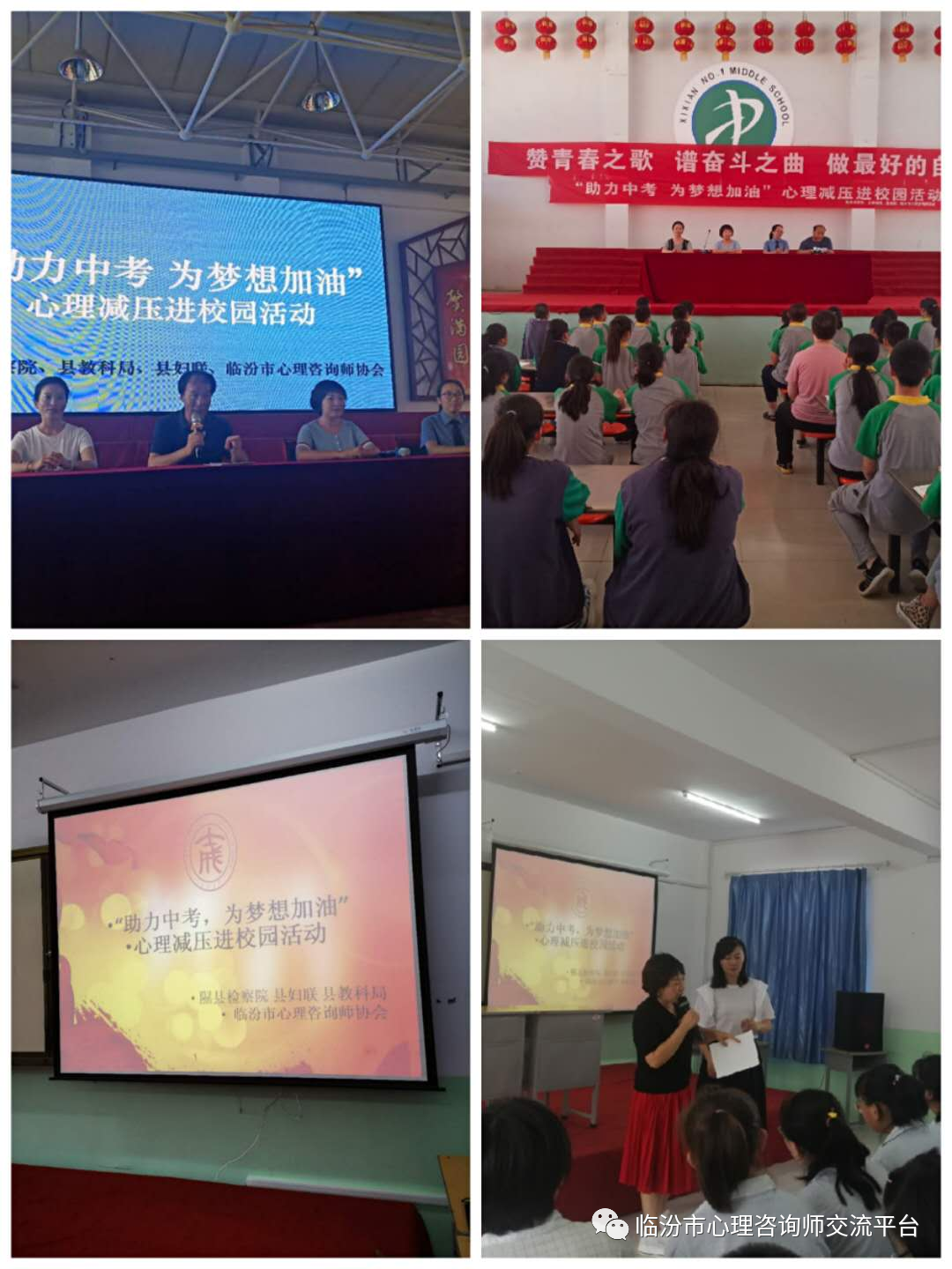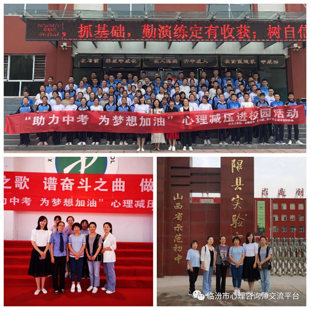 临汾市心理咨询师协会助力隰县初三学子中考减压 发布: 2020-07-17 191阅读 评论关闭 为全面坚实机关党委的要求,“践行领袖嘱托、率先蹚出新路”为中国共产党成立99周年献礼,7月10日-11日,临汾市心理咨询师协会郝红瑞会长、李俊凤副书记,与隰县妇联、检察院、教育局携手,为隰县初三学子举办了心理减压进校园活动。 两天四个学校1000余名考生受益,活动通过高考心理心理调节知识讲解、绘制生命线、与未来的自己对话、催眠减压等方式,每次活动短短一个半小时,让孩子们卸下了重负、坚定了信心,脸上绽放出了轻松的笑脸…… 本文来由临汾社会心理服务平台遍辑,转载请注明出处。https://lf12355.com/2020/07/%e4%b8%b4%e6%b1%be%e5%b8%82%e5%bf%83%e7%90%86%e5%92%a8%e8%af%a2%e5%b8%88%e5%8d%8f%e4%bc%9a%e5%8a%a9%e5%8a%9b%e9%9a%b0%e5%8e%bf%e5%88%9d%e4%b8%89%e5%ad%a6%e5%ad%90%e4%b8%ad%e8%80%83%e5%87%8f%e5%8e%8b/